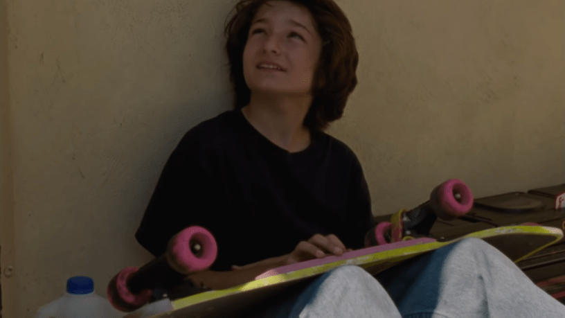 El pequeño Stevie (Sonny Suljic) puede ser moldeable como la plastilina y absorbente como una esponja. Pero esto, más que hacerlo carente de personalidad, convierte a En los 90 en el antídoto perfecto a la idea de que la personalidad es algo intangible e inamovible, una idea que muchas películas toman por sentado. A veces sobreestimamos lo libres que somos en realidad. Las primeras escenas de la película construyen una clara e inescapable relación entre estímulo y respuesta. En su primerísima toma, Stevie es castigado violentamente por su hermano mayor Ian (Lucas Hedges), por meterse a su cuarto sin su permiso. En la segunda, un suave movimiento de cámara nos lleva de la cama del niño (cubierta por sábanas de Las tortugas ninja) a Stevie mirándose en el espejo, examinando los golpes que acaba de recibir, pero también los flacos músculos de su cuerpo. Claramente no son suficientes para defenderse de su hermano.