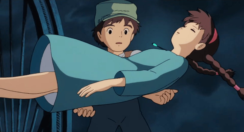 La primera de éstas sería El castillo en el cielo, dirigida por Miyazaki. La historia, que suena simple y tierna, sigue a dos niños, el minero Pazu y la princesa Sheeta, involucrados en la búsqueda de un mítico castillo flotante cuyos tesoros y poderes son codiciados por un noble ambicioso y un simpático grupo de piratas. Hay paralelos al trabajo previo del director. Como Lupin III es una aventura llena de persecuciones y como Nausicäa cuenta con una temática ambientalista y una heroína fuerte y determinada.