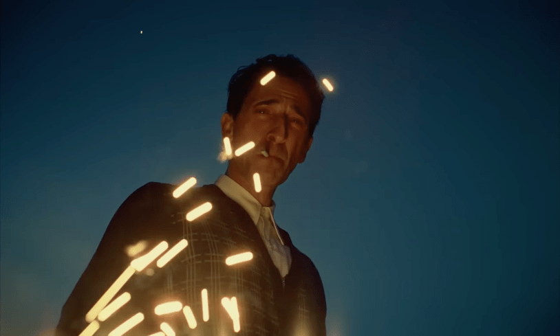 Podemos trazar comparaciones entre el proyecto de László y la película misma. Retrasada en múltiples ocasiones desde su anuncio en 2020 y filmada en Hungría e Italia por el ínfimo (para los estándares de Hollywood) monto de 10 millones de dólares, El brutalista es una película que existe a pesar de sus circunstancias; que parece haberse manifestado gracias a pura terquedad e ingenio. Hay detalles que delatan su presupuesto. Está filmada mayormente en interiores y carece de las espectaculares vistas y recreaciones históricas que vemos en muchas películas de época. Corbet recrea el periodo y el contexto histórico con trucos de bajo presupuesto: imágenes de archivo, música y programas de radio.