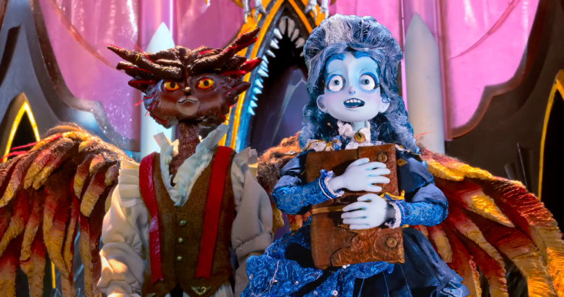 Dicho esto, me queda claro que Soy Frankelda trata de apegarse a esas mismas reglas, pero con resultados irregulares. Tiene personajes con objetivos y personalidades más o menos delineadas, claros héroes y villanos y un inicio, desarrollo y desenlace. Pero desde el inicio, la película es demasiado dispersa y caótica. Personajes, conceptos y reglas del mundo de los sustos son presentados a un ritmo abrumador. Líneas argumentales importantes, como el romance que florece entre Frankelda y Herneval, avanzan con poca o ninguna justificación. La trama se desarrolla como una serie de confusiones bastante endebles–pareciera que la característica principal de Frankelda es que es rápida a enojarse y sacar conclusiones–y se entorpece con constantes números musicales que la frenan en seco.