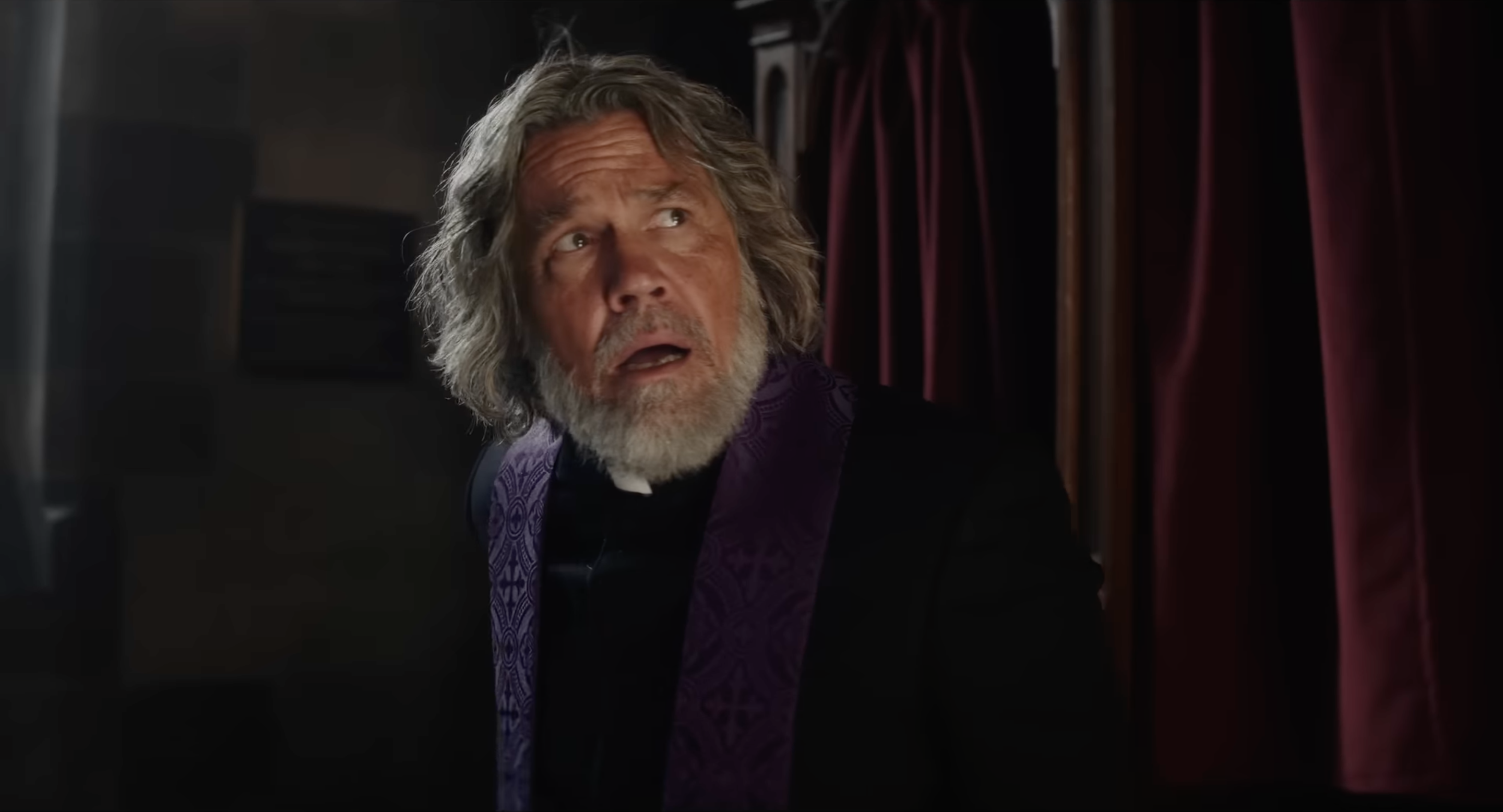 Aunque las sorpresas y los engaños son centrales a su encanto, las películas de Blanc también han construido sus propias normas que nos dan una idea más o menos clara de qué podemos esperar. Más que un investigador imparcial, Blanc de nuevo se comporta como el aliado de la única persona decente–la Marta Cabrera de Entre navajas y secretos, la Helen de Glass Onion– en un verdadero nido de víboras. Aquellas películas nos daban por lo menos unos momentos para llegar a esa conclusión, pero Wake Up Dead Man expedita el proceso poniéndonos desde el principio en el lugar de Jud Duplenticy (Josh O’Connor), un padre católico recientemente reasignado a la iglesia de la pequeña comunidad de Chimney Rock.